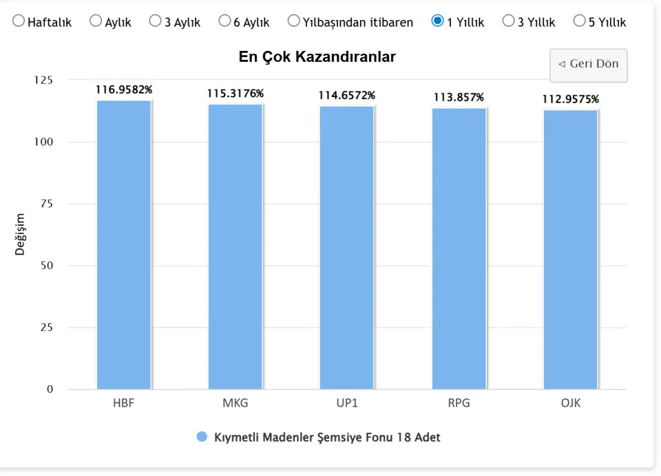 En çok kazandıran grup olan Kıymetli Madenler Şemsiye Fonu içerisinde yer alan 18 adet fon arasından bazıları performanslarıyla öne çıktı. Bu grupta en yüksek artışı %116,95 ile HBF kodlu fon elde etti. HBF fonunu %115,31 ile MKG, %114,65 ile UP1 ve %113,85 ile RPG kodlu fonlar izledi. Listenin beşinci sırasında ise %112,95 değişim oranıyla OJK kodlu fon bulundu. Ortaya çıkan bu tablo, son bir yıllık dönemde en yüksek getirinin kıymetli madenlere dayalı fonlarda toplandığını gösterdi.