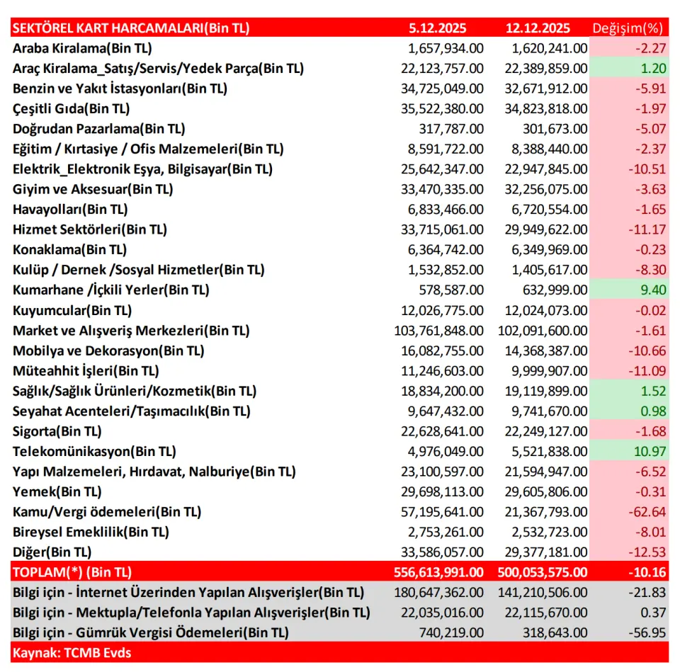 TCMB’nin açıkladığı veri setine göre; 12 Aralık haftasındaki toplam kart harcamaları, önceki haftaya göre yüzde 10,16 oranındaki keskin azalışla 500,0 Milyar TL civarında gerçekleşme gösterdi. Tutar bazında ortaya çıkan 56,6 Milyar TL’lik gerilemeye en yüksek etki; 35,8 Milyar TL ile ‘’Kamu/Vergi Ödemeleri’’ harcama grubundan geldi. Harcama gruplarındaki haftalık değişimlere ‘oransal’ olarak bakıldığında; En yüksek kartlı harcama artışı gösteren gruplar; yüzde 10,97 ile ‘’Telekomünikasyon’’, yüzde 9,40 ile ‘’Kumarhane/İçkili Yerler’’ ve yüzde 1,52 ile de ‘’Sağlık, Sağlık Ürünleri/Kozmetik’’ oldu. En yüksek kartlı harcama azalışı ise; yüzde 62,64 ile ‘’Kamu/Vergi Ödemeleri’’ grubunda yaşandı. Bu grubu takip eden, yüksek harcama azalışı gösteren diğer gruplar; yüzde 12,53 ile ‘’Diğer-Tasnif Dışı’’ ve yüzde 11,17 ile de ‘’Hizmet’’ olarak gerçekleşti.