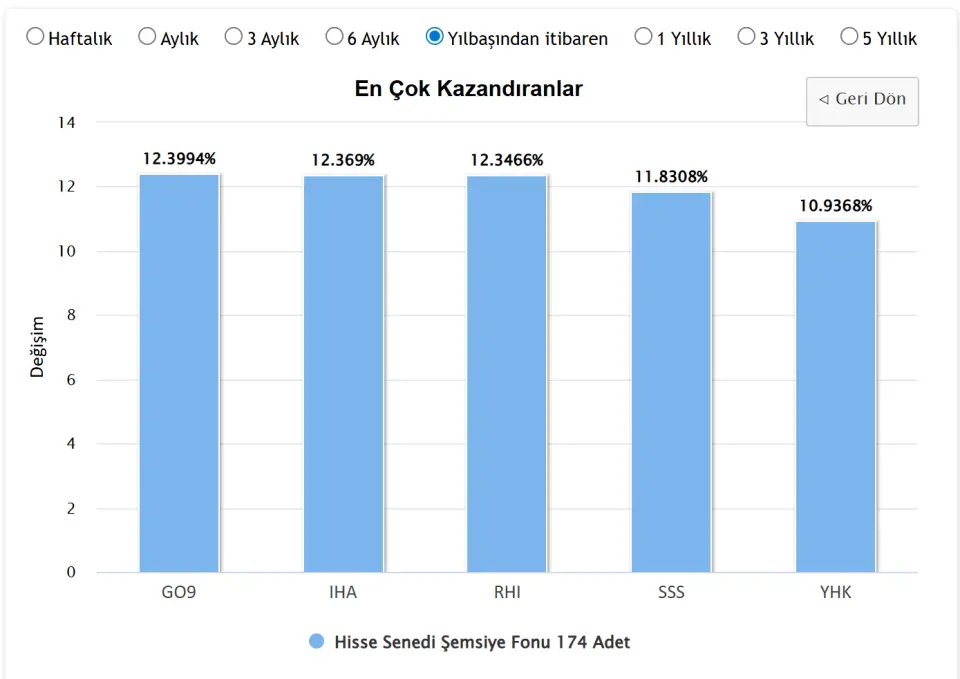 Hisse Senedi Şemsiye Fonu kategorisi altındaki bireysel fonlar incelendiğinde ise getirilerin şemsiye fon ortalamasının üzerine çıktığı görüldü. Yılbaşından itibaren en yüksek performansı gösteren fon, yüzde 12,40'lık getiri oranıyla GO9 kodlu fon oldu. Zirveyi çok küçük farklarla takip eden IHA kodlu fon yüzde 12,37, RHI kodlu fon ise yüzde 12,35 oranında değer kazandı. Listenin ilk 5'inde yer alan diğer fonlar ise yüzde 11,83 getiri ile SSS ve yüzde 10,94 artışla YHK olarak sıralandı.