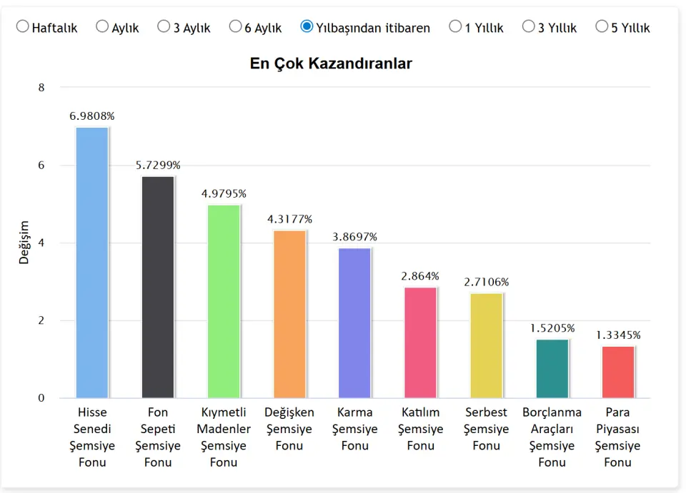 TEFAS verilerine göre, yılbaşından bu yana geçen sürede yatırım fonlarının getiri performansları netleşti. Fon piyasasında yılın başından itibaren yatırımcısına en yüksek getiriyi sunan grup Hisse Senedi Şemsiye Fonları oldu. Bu grup, ortalama yüzde 6,98 oranında değer kazanarak listenin zirvesine yerleşti. Getiri sıralamasında hisse senedi fonlarını, yüzde 5,73'lük artışla Fon Sepeti Şemsiye Fonu ve yüzde 4,98'lik performansla Kıymetli Madenler Şemsiye Fonu takip etti.