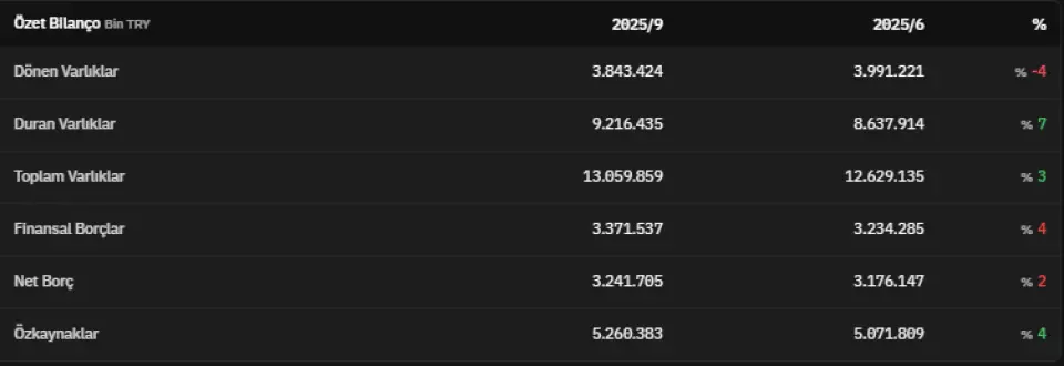 Dönen varlıklar 2025 yılının üçüncü çeyreğinde 3.843.424.000 TL olmuştur. 2025 yılının üçüncü çeyreğinde 9.216.435.000 TL olarak açıklanan duran varlıklar, 2025 yılının ikinci çeyreğinde 8.637.914.000 TL olarak açıklanmıştı. Toplam varlıklar üçüncü çeyrekte 13.059.859.000 TL olarak kaydedildi.