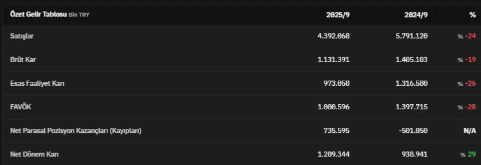 FAVÖK 2025 yılının üçüncü çeyreğinde 1.000.596.000 TL olarak açıklandı. Net parasal pozisyon kazançları ise 735.595.000 TL olarak kaydedildi. Net dönem kârı 1.209.344.000 TL olarak kaydedildi. 2024 yılının üçüncü çeyreğinde 938.941.000 TL olarak açıklanan net dönem karı, 2025 yılının üçüncü çeyreğinde %29 artmış oldu.