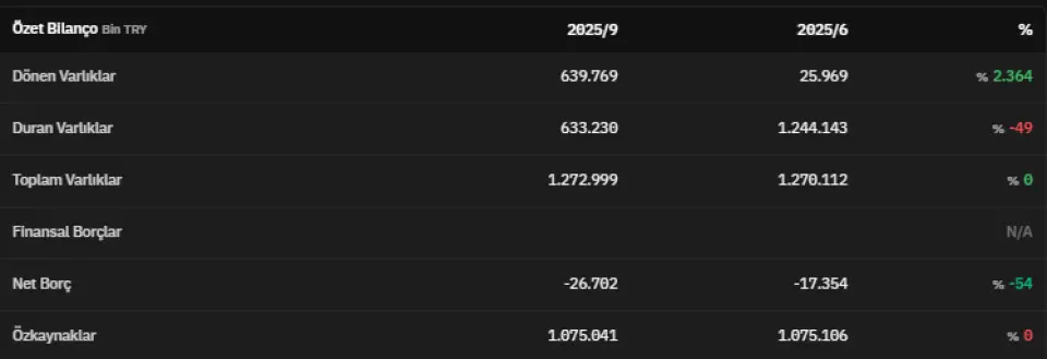 Dönen varlıklar 2025 yılının üçüncü çeyreğinde 639.769.000 TL olmuştur. 2025 yılının ikinci çeyreğinde 25.969.000 TL olarak açıklanan dönen varlıklar, 3. çeyrekte %2.364 artmış oldu. 2025 yılının üçüncü çeyreğinde 633.230.000 TL olarak açıklanan duran varlıklar, 2025 yılının ikinci çeyreğinde 1.244.143.000 TL olarak açıklanmıştı. Toplam varlıklar üçüncü çeyrekte 1.272.999.000 TL olarak kaydedildi.