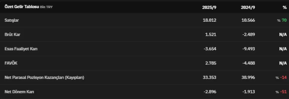 FAVÖK 2025 yılının üçüncü çeyreğinde 2.785.000 TL olarak açıklandı. Net parasal pozisyon kazançları 2025 yılının üçüncü çeyreğinde 33.353.000 TL olarak kaydedildi. Net dönem kârı ise -2.896.000 TL olarak kaydedildi.