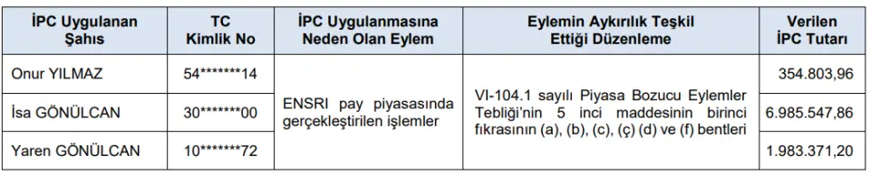 İPC Uygulanmasına Neden Olan Eylem: ENSRI pay piyasasında gerçekleştirilen işlemlerEylemin Aykırılık Teşkil Ettiği Düzenleme: VI-104.1 sayılı Piyasa Bozucu Eylemler Tebliği’nin 5 inci maddesinin birinci fıkrasının (a), (b), (c), (ç) (d) ve (f) bentler