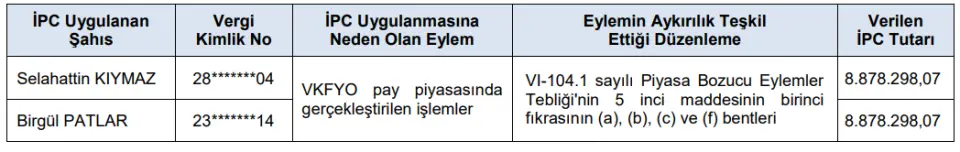 - Vakıf Menkul Kıymet Yatırım Ortaklığı AŞ (VKFYO) pay piyasasında gerçekleştirilen işlemler ile ilgili olarak yapılan inceleme sonucunda, aşağıdaki tabloda yer alan idari para cezalarının uygulanmasına karar verilmiştir.
