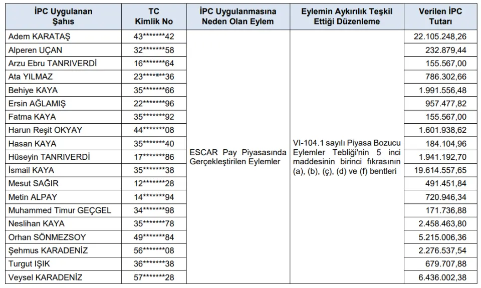 İPC Uygulanmasına Neden Olan Eylem: ESCAR Pay Piyasasında Gerçekleştirilen EylemlerEylemin Aykırılık Teşkil Ettiği Düzenleme: VI-104.1 sayılı Piyasa Bozucu Eylemler Tebliği'nin 5 inci maddesinin birinci fıkrasının (a), (b), (ç), (d) ve (f) bentleri