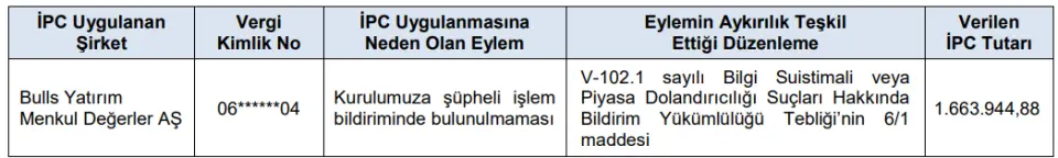 - Bulls Yatırım Menkul Değerler AŞ hakkında 6362 sayılı Sermaye Piyasası Kanunu (SPKn)’nun 102 nci maddesi ve V102.1 sayılı Bilgi Suistimali veya Piyasa Dolandırıcılığı Suçları Hakkında Bildirim Yükümlülüğü Tebliği’nin ilgili hükümleri çerçevesinde yapılan inceleme sonucunda aşağıdaki tabloda yer alan idari para cezasının uygulanmasına karar verilmiştir