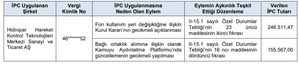 İPC Uygulanan Şirket: Hidropar Hareket Kontrol Teknolojileri Merkezi Sanayi ve Ticaret AŞİPC Uygulanmasına Neden Olan Eylem: Fon kullanım yeri değişikliğine ilişkin Kurul Kararı’nın gecikmeli açıklanması