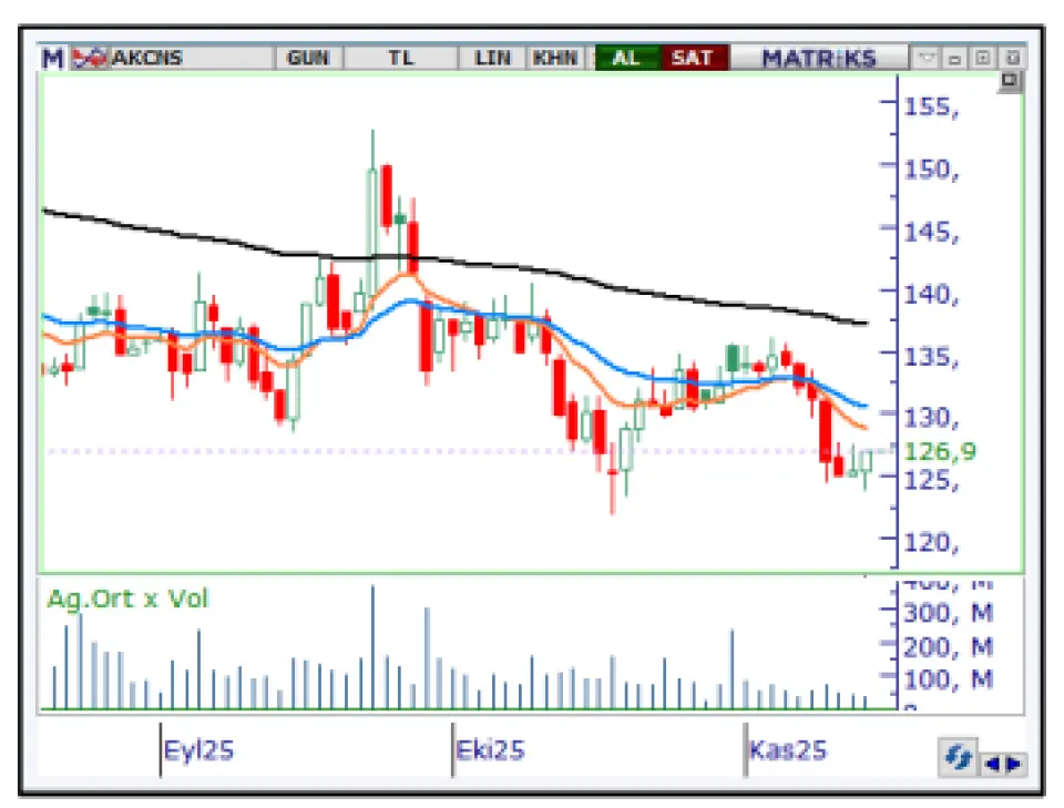 AKCNS hissesi için açıklanan hedef fiyat 130.00 TL. Bununla birlikte şirketin 2025 yılının üçüncü çeyreğinde açıkladığı net dönem karı 487.432.000 TL Şirket geçen yılın aynı döneminde 1.654.126.000 TL kâr açıklamıştı. 2025 yılının üçüncü çeyreğinde ise özkaynaklar 24.005.840.000 TL olarak açıklandı.