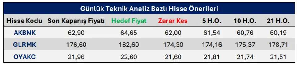 PhillipCapital, 25 Kasım 2025 tarihine ait günlük bültenini yayınladı. Yayınlanan bültende 3 farklı hisse için teknik analiz hisse önerileri paylaşıldı. PhillipCapital tarafından paylaşılan teknik analiz hisse önerileri, AKBNK, GLRMK ve OYAKC hisseleri için yapıldı. Paylaşılan önerilerin detaylarına bakacak olursak;