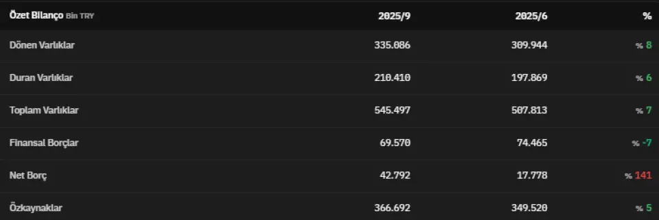 Dönen varlıklar 2025 yılının üçüncü çeyreğinde 335.086.000 TL olmuştur. 2025 yılının üçüncü çeyreğinde 210.410.000 TL olarak açıklanan duran varlıklar, 2025 yılının ikinci çeyreğinde 197.869.000 olarak açıklanmıştı. Toplam varlıklar üçüncü çeyrekte 545.497.000 TL olarak kaydedildi. Finansal borçlar 2025 yılının üçüncü çeyreğinde 69.570.000 TL olarak kaydedildi.