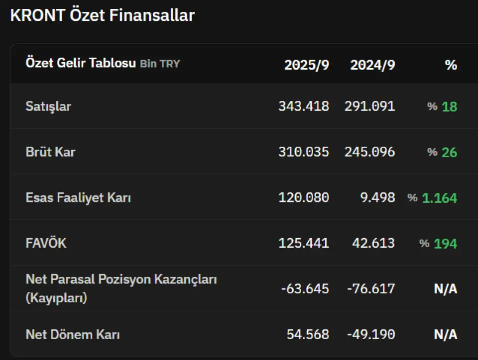 Kron Teknoloji KRONT bu yıl 3. çeyrek bilançosunda zararını kapattı ve kara geçti. Şirket geçen yıl 3. çeyrekte 49.190.000 TL zarar açıklamıştı. Bu yıl 3. çeyrekte bu zarar kapandı ve şirket 54.568.000 TL kara geçti.