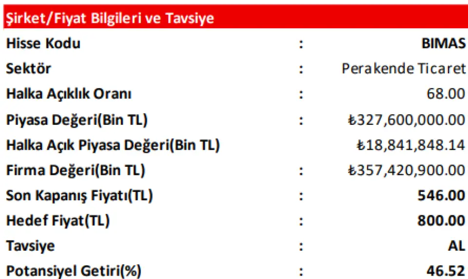 Alnus Yatırım BIMAS hissesi için 800 TL hedef fiyat açıklayarak AL tavsiyesi verdi.