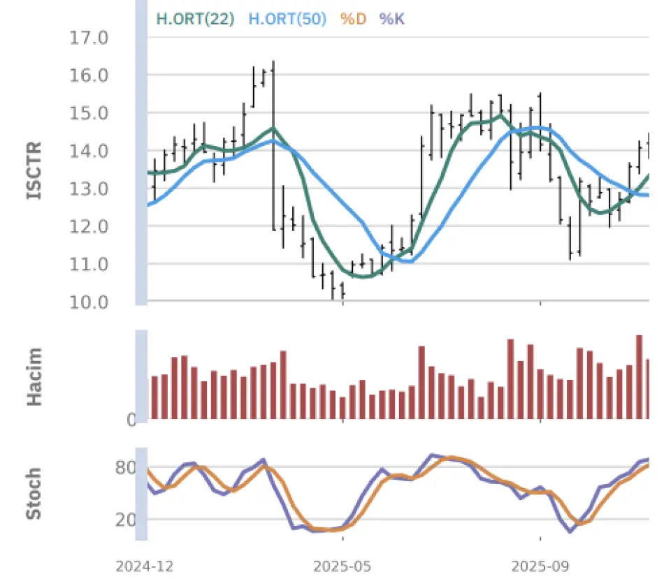 "Gün içinde en düşük 13.84 en yüksek 14.11 seviyesini gören Türkiye İş Bankası C hissesinin günü %0.14 kazançla tamamladığı gözlenmektedir. Pivot seviye 13.95 seviyesinden geçmekte olup, aşağı yönlü hareketlerde birinci destek 13.80, ikinci destek ise 13.68 seviyesinden geçmektedir. Dirençler ise sırasıyla 14.07, 14.22 seviyelerinden geçmektedir. Bu aşamada endeksin 5 günlük HO seviyesinin %1.21 altında, 22 günlük HO seviyesinin ise %4.37 üstünde hareket ettiği dikkat çekmektedir. Son gün işlem hacmi ise bu aşamada 5 günlük ortalama işlem hacminin % 22.39 altında gerçekleşmiştir."