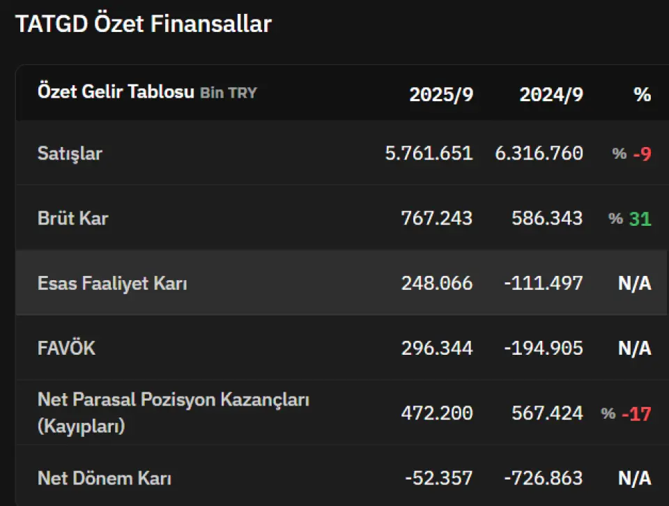 Finansal Görünüm ve Genel Değerlendirme:Tat Gıda yönetimi, 2025 yılının operasyonel açıdan maliyet disiplini ve verimlilik önceliğiyle şekillendiğini vurguladı. Üçüncü çeyrek sonuçları, faaliyet giderlerindeki azalma ve etkin maliyet yönetimi sayesinde kârlılıktaki toparlanma eğiliminin sürdüğünü ortaya koydu. Net zarar 2024’ün aynı dönemindeki 727 milyon TL seviyesinden 52 milyon TL’ye gerilerken, net finansal borç 3.853 milyon TL’den 3.206 milyon TL’ye düştü. Şirketin likidite oranı 0,13’e yükselerek bilanço tarafında iyileşme sinyali verdi.