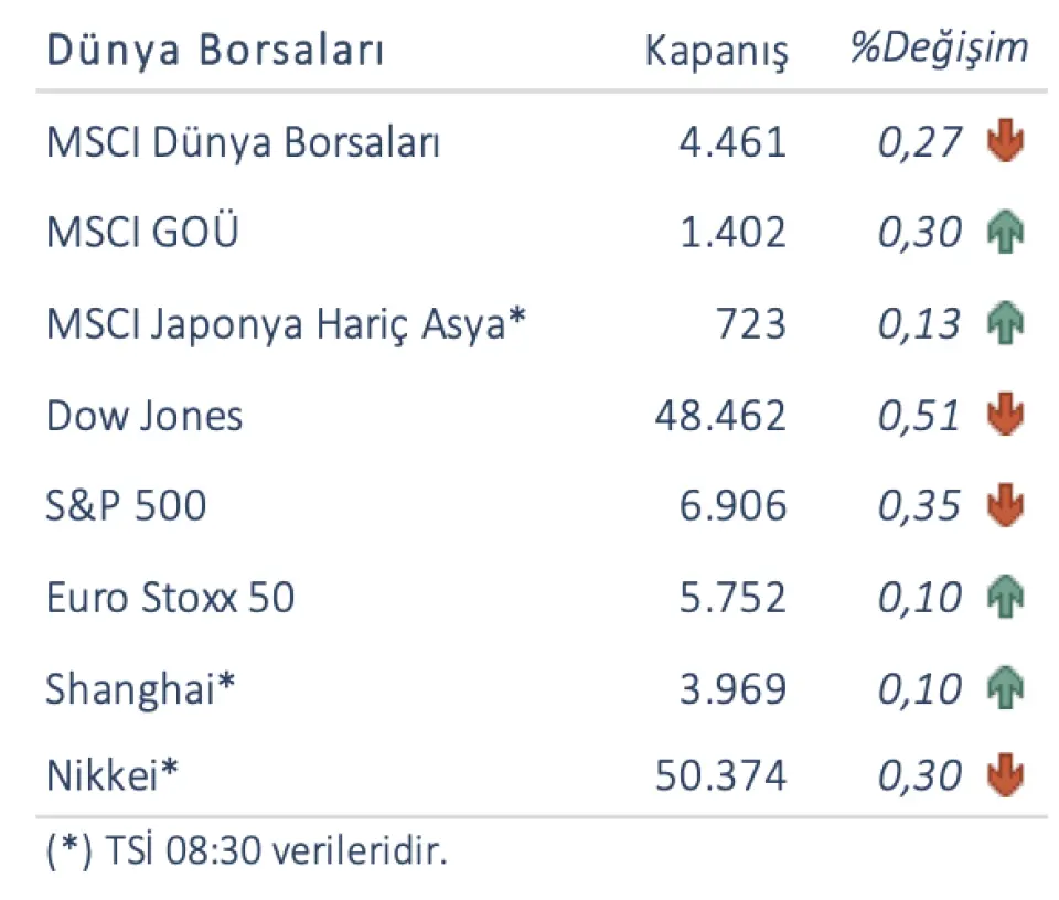 Bununla birlikte, tatil dönemi dolayısıyla düşük işlem hacminin volatiliteyi arttırdığı haftanın ilk işlem gününde ABD hisse senedi piyasaları genel olarak aşağı yönlü bir seyir izledi. Özellikle yapay zeka temalı hisselerde değerlemelere ilişkin endişelerin gündemdeki yerini koruması teknoloji hisselerinin gerilemesinde etkili oluyor.