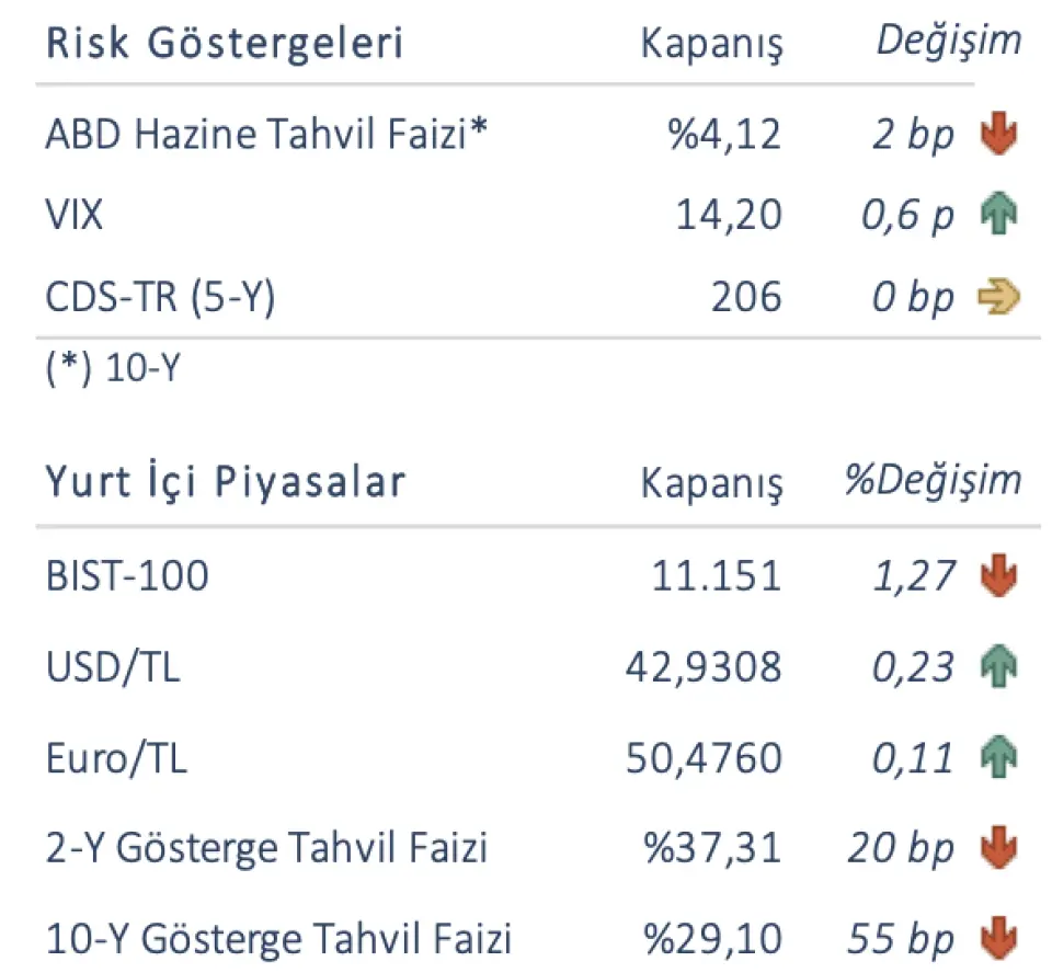 BIST-100 endeksi Pazartesi gününü %1,3 düşüşle 11.151 seviyesinde tamamladı. USD/TL ve EUR/TL hafif yükseliş kaydederken, 2 ve 10 yıllık gösterge tahvillerin faiz oranları sırasıyla 20 ve 55 baz puan düşerek %37,31 ve %29,10 oldu.