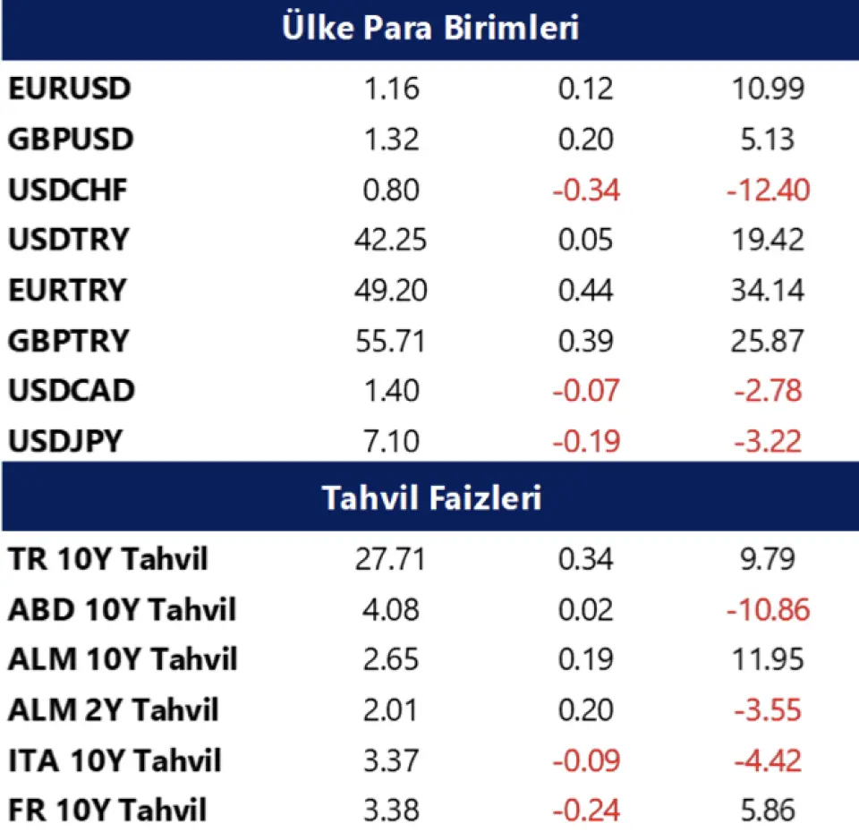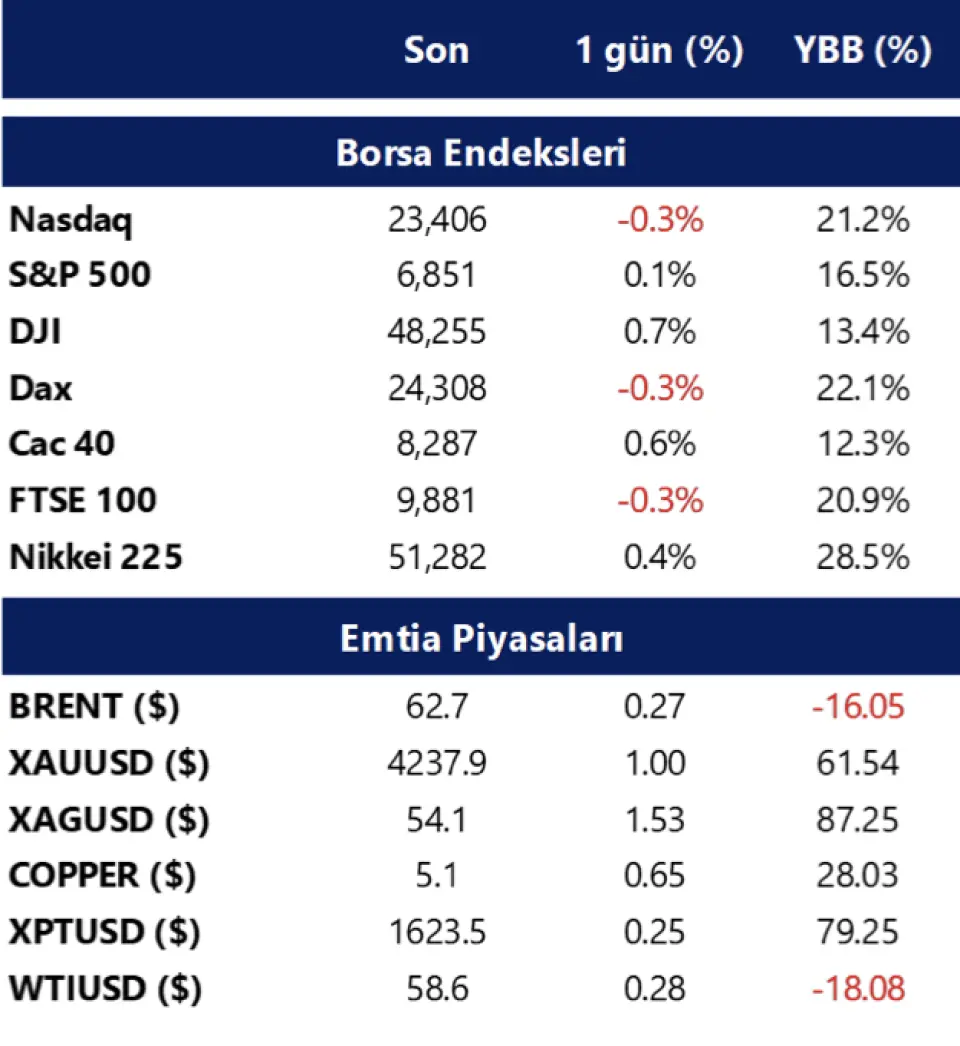 Öğle saatlerinde ABD vadelileri ve Avrupa borsaları karışık seyrediyor. Asya borsalarında da bugün itibariyle karışık bir görünüm hakim. Özetle küresel risk iştahı pozitif seyrediyor. Emtia tarafında brent tipi ham petrol 62,7 $/varil civarında seyrederken, altının ons fiyatı 4.250 $ eşiğinde. Bitcoin 103.100 $, Ethereum ise 3.550 $ civarında işlem görüyor.