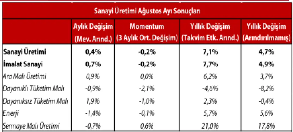 Mevsim ve takvim etkisinden arındırılmış verilere göre toplam sanayi üretimi Ağustos’ta bir önceki aya göre %0,4 genişledi. Takvim etkisinden arındırılmış verilere göre ise yıllık bazda sanayi üretimi %7,1 artış kaydetti.