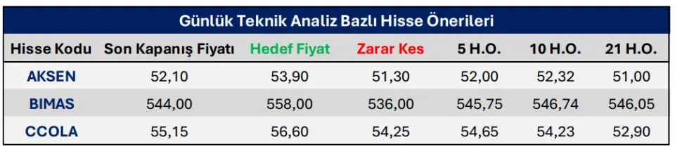 PhillipCapital, 19 Kasım 2025 tarihine ait günlük bültenini yayınladı. Yayınlanan bültende 3 farklı hisse için teknik analiz hisse önerileri paylaşıldı. PhillipCapital tarafından paylaşılan teknik analiz hisse önerileri, AKSEN, BIMAS ve CCOLA hisseleri için yapıldı. Paylaşılan önerilerin detaylarına bakacak olursak;
