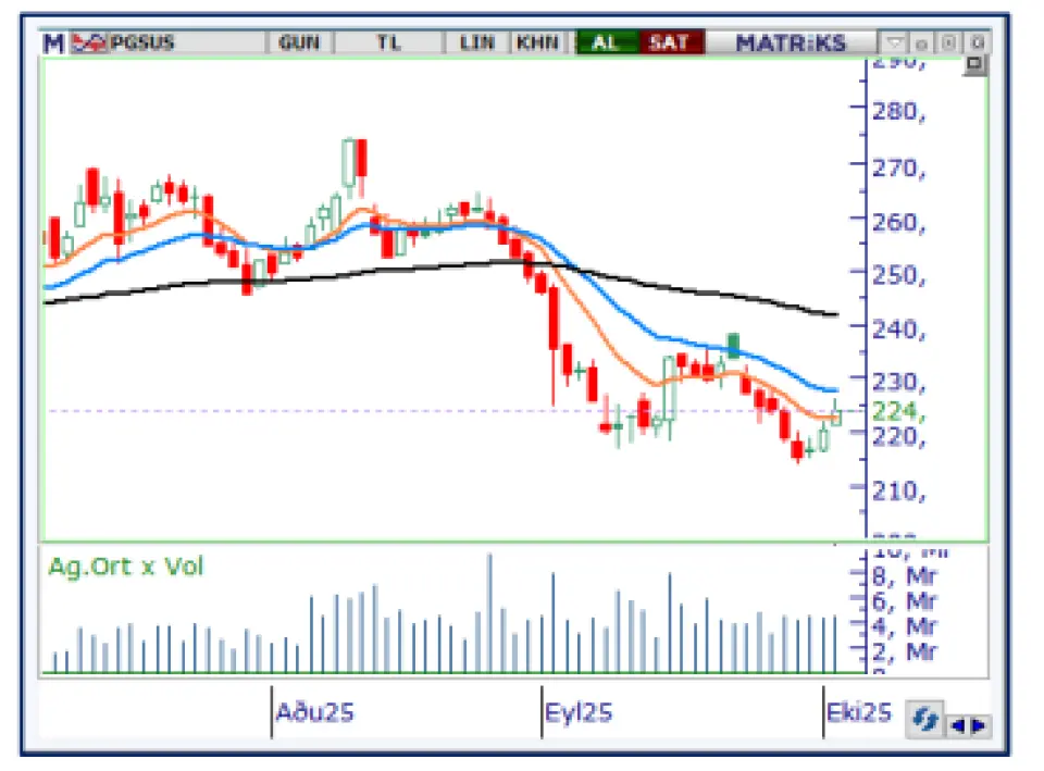 PGSUS hissesi için açıklanan hedef fiyat 231,50 TL. Bununla birlikte şirketin 2025 yılının ikinci çeyreğinde açıkladığı net dönem karı 2.497.837.000 TL. Şirket geçen yılın aynı döneminde 496.187.000 TL kâr açıklamıştı. 2025 yılının ilk yarısında açıklanan özkaynaklar ise 97.122.362.000 TL.