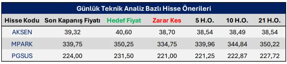 PhillipCapital, 3 Ekim 2025 tarihine ait günlük bültenini yayınladı. Yayınlanan bültende 3 farklı hisse için teknik analiz hisse önerileri paylaşıldı. PhillipCapital tarafından paylaşılan teknik analiz hisse önerileri, AKSEN, MPARK ve PGSUS hisseleri için yapıldı. Paylaşılan önerilerin detaylarına bakacak olursak;