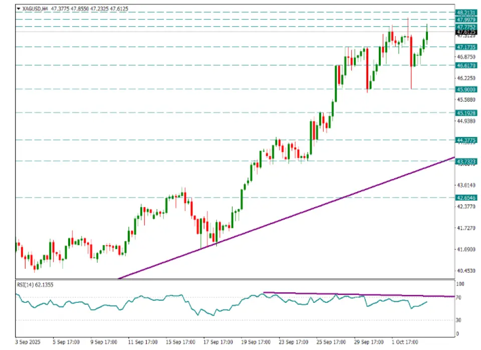 Ons Gümüş günlük bazda aşırı alış bölgesinde tutunmayı sürdürüyor ve burada henüz negatif uyumsuzluk yok. Ancak dört saatlik grafikte dünden bu yana yeni tepe gelmediği için bir zayıflık var. Bir süre eğer yeni tepe gelmezse zayıflık belirginleşebilir. Zayıflık belirginleşmemesi için en azından 47.77’in üzerinde dört saatlik mum kapanışları görmeye ihtiyaç var.