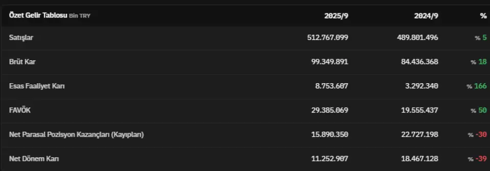 FAVÖK 2025 yılının üçüncü çeyreğinde 29.385.069.000 TL olarak açıklandı. Net parasal pozisyon kazançları 2025 yılının üçüncü çeyreğinde 15.890.350.000 TL olarak kaydedildi. Net dönem kârı ise 11.252.907.000 TL olarak kaydedildi. İlgili veri 2024 yılının üçüncü çeyreğinde 18.467.128.000 TL olarak açıklanmıştı.