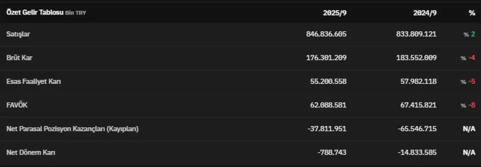 FAVÖK 2025 yılının üçüncü çeyreğinde 62.088.581.000 TL olarak açıklandı. Net parasal pozisyon kazançları 2025 yılının üçüncü çeyreğinde -37.811.951.000 TL olarak kaydedildi. Net dönem kârı ise -788.743.000 TL olarak kaydedildi. İlgili veri 2024 yılının üçüncü çeyreğinde -14.833.585.000 TL olarak açıklanmıştı.