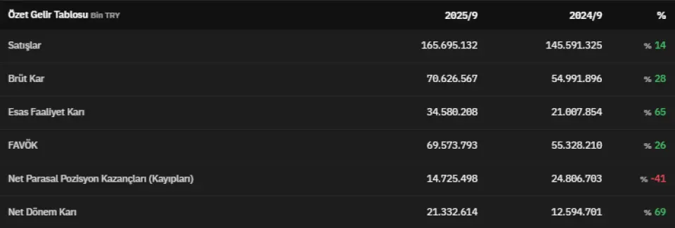 FAVÖK 2025 yılının üçüncü çeyreğinde 69.573.793.000 TL olarak açıklandı. Net parasal pozisyon kazançları 2025 yılının üçüncü çeyreğinde 14.725.498.000 TL olarak kaydedildi. Net dönem kârı ise 21.332.614.000 TL olarak kaydedildi. İlgili veri 2024 yılının üçüncü çeyreğinde 12.594.701.000 TL olarak açıklanmıştı. Böylece net dönem karı %69 artmış oldu.