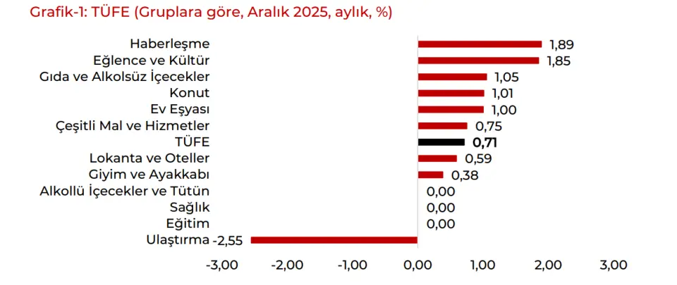 Aşağı yönlü desteklemede: - Ulaştırmada bilet fiyatlarında noel ve yılbaşı etkisinin oluşu, - SUT zammının henüz gelmemesi ve Ocak ayına kalma olasılığı, - Alkollü içecekler ve tütün tarafında maktu değişimin önceki ayda tamamlanması, - Eğitim tarafında aktif sezonun sona ermesi TÜFE altı kalıp aşağı yönlü destek vermektedir.