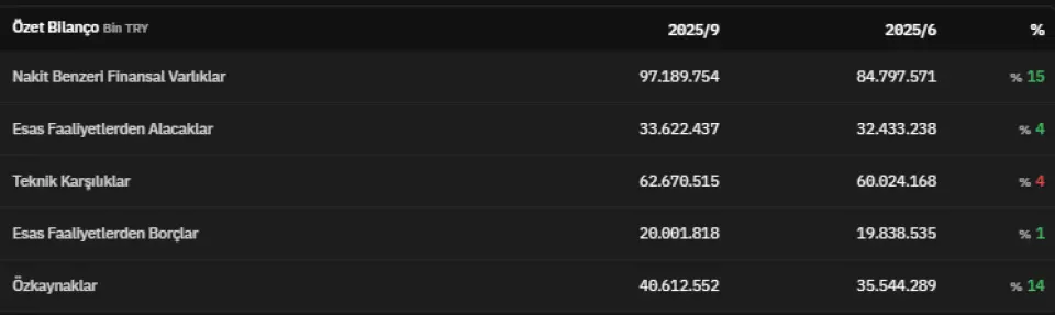 Nakit benzeri finansal varlıklar 2025 yılının üçüncü çeyreğinde 97.189.754.000 TL olmuştur. 2025 yılının üçüncü çeyreğinde 33.622.437.000 TL olarak açıklanan esas faaliyetlerden alacaklar, 2025 yılının ikinci çeyreğinde 32.433.238.000 TL olarak açıklanmıştı. Teknik karşılıklar 2025 yılının üçüncü çeyreğinde 62.670.515.000 TL olarak kaydedildi.2025 yılının üçüncü çeyreğinde esas faaliyetlerden borçlar 20.001.818.000 TL olarak açıklandı. Özkaynaklar 2025 yılının üçüncü çeyreğinde 40.612.552.000 TL olarak açıklandı. İlgili veri 2025 yılının ikinci çeyreğinde 35.544.289.000 TL olarak açıklanmıştı. Böylece özkaynaklar, 2025 yılının üçüncü çeyreğinde %14 artmış oldu.