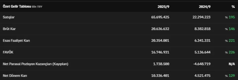 Satışlar 2025 yılının 3. çeyreğinde 65.695.425.000 TL olarak açıklandı. 2025 yılının üçüncü çeyreğinde brüt kar 20.636.632.000 TL olarak açıklandı. 2024 yılının üçüncü çeyreğinde ise bu veri 8.382.818.000 TL olarak açıklanmıştı. Böylece brüt kar 3. çeyrekte %146 artmış oldu. Esas faaliyet karını 20.354.001.000 TL olarak açıklayan EKGYO, 2024 yılının üçüncü çeyreğinde esas faaliyet karını 6.341.331.000 TL olarak açıklamıştı.FAVÖK 2025 yılının üçüncü çeyreğinde 16.746.931.000 TL olarak açıklandı. Net parasal pozisyon kazançları (kayıpları) 2025 yılının üçüncü çeyreğinde 1.738.500.000 TL olarak kaydedildi. Net dönem kârı ise 10.336.401.000 TL olarak kaydedildi. İlgili veri 2024 yılının üçüncü çeyreğinde 4.521.475.000 TL olarak açıklanmıştı.