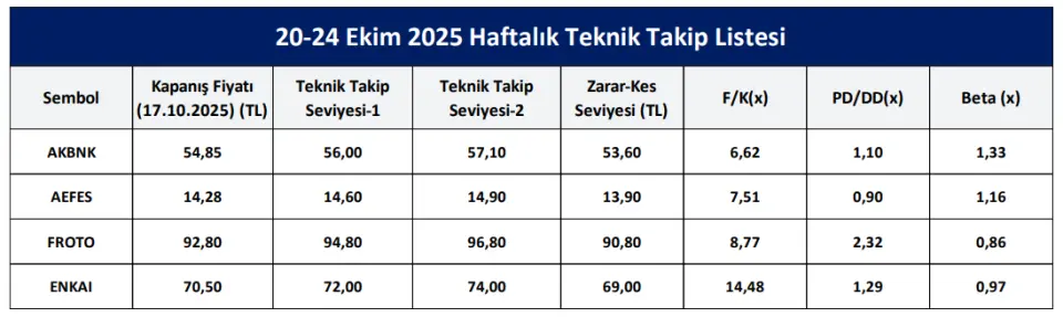 Ikon Menkul, 20 Ekim 2025 tarihinde "Haftalık Teknik Takip Listesi" raporunu paylaştı.