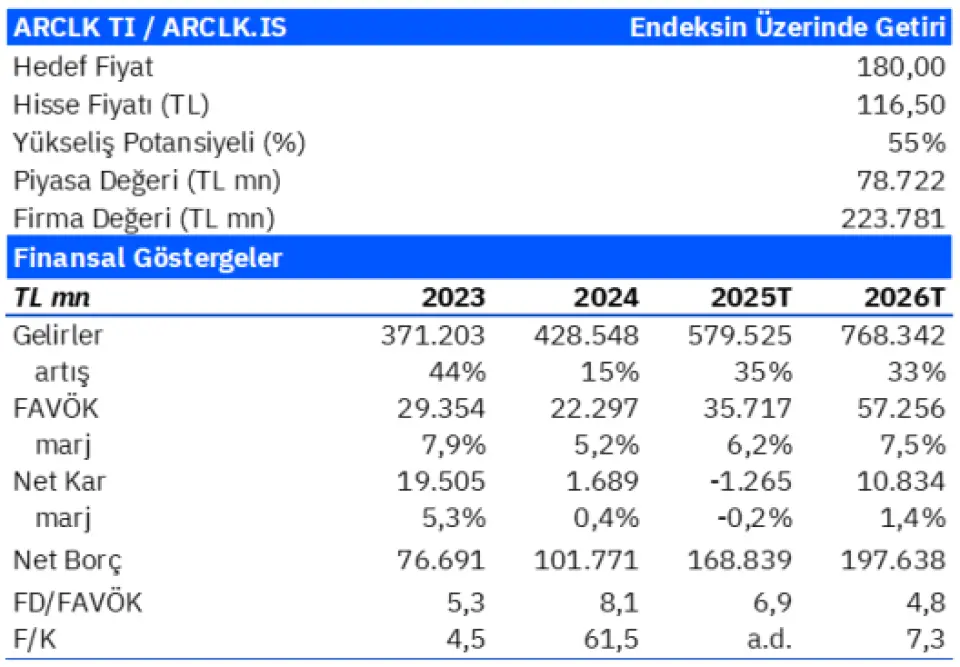 Arçelik Hissesine 180 TL Hedef Fiyat Verildi %55 Kazanç Potansiyeli