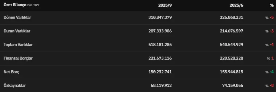 Dönen varlıklar 2025 yılının üçüncü çeyreğinde 310.847.379.000 TL olmuştur. 2025 yılının üçüncü çeyreğinde 207.333.906.000 TL olarak açıklanan duran varlıklar, 2025 yılının ikinci çeyreğinde 214.676.597.000 TL olarak açıklanmıştı. Toplam varlıklar üçüncü çeyrekte 518.181.285.000 TL olarak kaydedildi. Finansal borçlar 2025 yılının üçüncü çeyreğinde 221.673.116.000 TL olarak açıklandı. 2025 yılının ikinci çeyreğinde 220.528.228.000 TL olarak açıklanan finansal borçlar, 3 çeyrekte %1 artmış oldu. 2025 yılının üçüncü çeyreğinde net borç 150.232.741.000 TL olarak açıklandı. Özkaynaklar 2025 yılının üçüncü çeyreğinde 68.119.912.000 TL olarak açıklandı. İlgili veri 2025 yılının ikinci çeyreğinde 74.159.055.000 TL olarak açıklanmıştı. Böylece özkaynaklar, 2025 yılının 3. çeyreğinde %8 azalmış oldu.