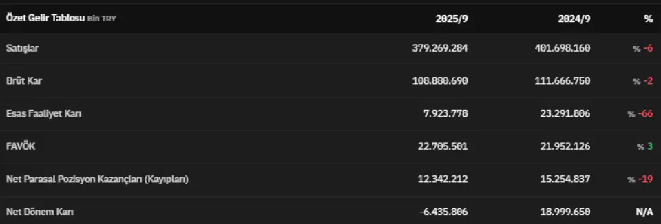 FAVÖK 2025 yılının üçüncü çeyreğinde 22.705.501.000 TL olarak açıklandı. Net parasal pozisyon kazançları 2025 yılının üçüncü çeyreğinde 12.342.212.000 TL olarak kaydedildi. Net dönem kârı ise -6.435.806.000 TL olarak kaydedildi.
