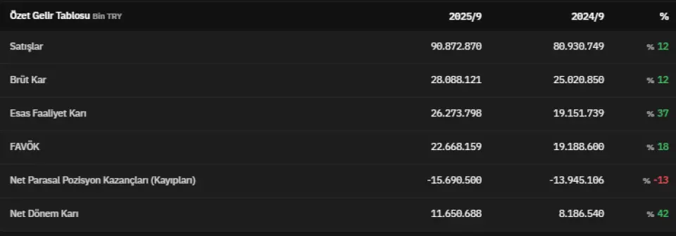 FAVÖK 2025 yılının üçüncü çeyreğinde 22.668.159.000 TL olarak açıklandı. Net parasal pozisyon kazançları 2025 yılının üçüncü çeyreğinde -15.690.500.000 TL olarak kaydedildi. Net dönem kârı ise 11.650.688.000 TL olarak kaydedildi. İlgili veri 2024 yılının üçüncü çeyreğinde 8.186.540.000 TL olarak açıklanmıştı. Böylece ilgili veri %42 artmış oldu.