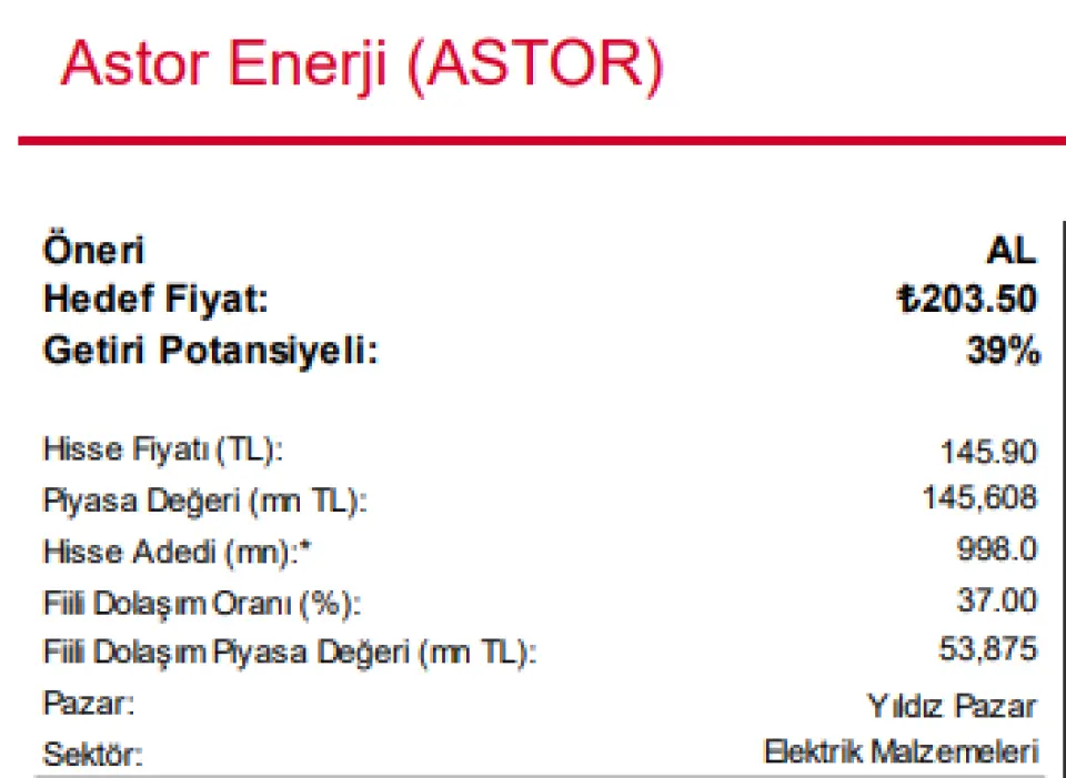 ASTOR İçin 203,50 TL Hedef Fiyat Açıklandı! Global Menkul model portföyüne de aldığı ASTOR hissesi için 203,50 TL hedef fiyat tespit etti. Bu hedef hissede %39 oranında kazanç potansiyeline işaret ediyor.