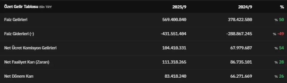 Faiz gelirleri 2025 yılının 3. çeyreğinde 569.400.840.000 TL olarak açıklandı. 2024 yılının 3. çeyreğinde 378.422.580.000 TL olan faiz gelirleri, 2025 yılının 3. çeyreğinde %50 artmış oldu. 2025 yılının üçüncü çeyreğinde faiz giderleri -431.551.404.000 TL olarak açıklandı. 2024 yılının üçüncü çeyreğinde ise bu veri -288.867.245.000 TL olarak açıklanmıştı. Net ücret komisyon gelirlerini 104.410.331.000 TL olarak açıklayan GARAN, 2024 yılının üçüncü çeyreğinde net ücret komisyon gelirlerini 67.979.687.000 TL olarak açıklamıştı. Böylece ilgili veri %54 artmış oldu.Net faaliyet karı 2025 yılının üçüncü çeyreğinde 111.318.265.000 TL olarak açıklandı. 2024 yılının üçüncü çeyreğinde 86.735.101.000 TL olarak açıklanan net faaliyet karı, 2025 yılının üçüncü çeyreğinde %28 artmış oldu. Net dönem kârı ise 83.418.240.000 TL olarak kaydedildi. İlgili veri 2024 yılının üçüncü çeyreğinde 66.271.669.000 TL olarak açıklanmıştı. Böylece net dönem karı, 2025 yılının üçüncü çeyreğinde %26 artmış oldu.