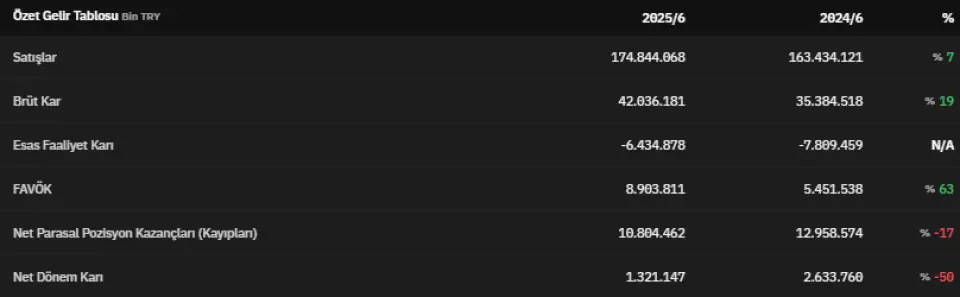 Şirket 2025 yılının ikinci çeyreğinde 174.844.068.000 TL satış gerçekleştirmiştir. 2024 yılının aynı dönemine oranla satış geliri %7 arttı. 2024 yılının ikinci çeyreğinde satışlar 163.434.121.000 TL olarak kayıtlara geçmişti. 2025 yılının ikinci çeyreğinde brüt kar 42.036.181.000 TL olarak açıklanmıştır. 2024 yılının ikinci çeyreğinde ise bu veri 35.384.518.000 TL olarak açıklanmıştı.Esas faaliyet karını -6.434.878.000 TL olarak açıklayan şirket, 2024 yılının ikinci çeyreğinde esas faaliyet karını -7.809.459.000 TL olarak açıklamıştı. FAVÖK 2025 yılının ikinci çeyreğinde 8.903.811.000 TL olarak açıklanmıştır. 2024 yılının ikinci çeyreğinde 5.451.538.000 TL olarak açıklanan FAVÖK, 2025 yılının ikinci çeyreğinde %63 artmış oldu.