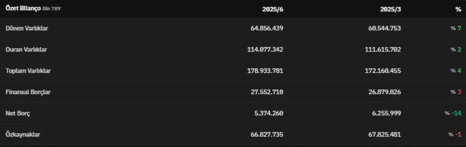 Dönen varlıklar 2025 yılının ikinci çeyreğinde 64.856.439.000 TL olarak açıklandı. 2025 yılının ikinci çeyreğinde 114.077.342.000 TL olarak açıklanan duran varlıklar ise, 2025 yılının ilk çeyreğinde 111.615.702.000 TL olarak açıklanmıştı. Toplam varlıklar 2025 yılının ikinci çeyreğinde 178.933.781.000 TL olarak kaydedildi. 2025 yılının ilk çeyreğinde 172.160.455.000 TL olarak açıklanan toplam varlıklar, 2025 yılının ikinci çeyreğinde %4 artmış oldu.Finansal borçlar 2025 yılının ikinci çeyreğinde 27.552.710.000 TL olarak açıklandı. 2025 yılının ilk çeyreğinde 26.879.026.000 TL olarak açıklanan finansal borçlar, 2025 yılının ikinci çeyreğinde %3 artmış oldu. 2025 yılının ikinci çeyreğinde net borç 5.374.260.000 TL olarak açıklandı. 2025 yılının ilk çeyreğinde 6.255.999.000 TL olarak açıklanan net borç, 2025 yılının ikinci çeyreğinde %14 azalmış oldu. Özkaynaklar ise 2025 yılının ikinci çeyreğinde 66.827.735.000 TL olarak duyuruldu.