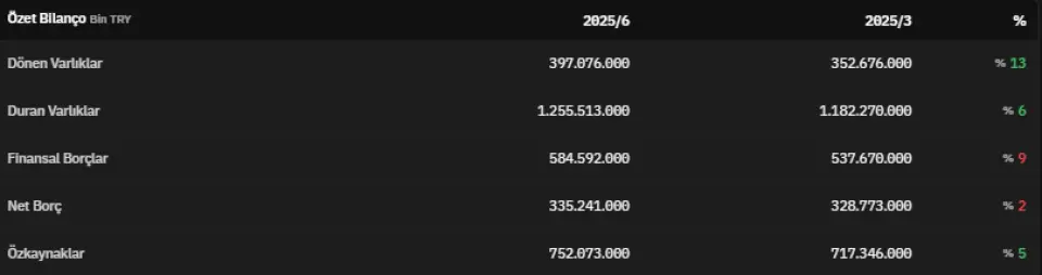 Finansal borçlar 2025 yılının ikinci çeyreğinde 584.592.000.000 TL olarak açıklandı. 2025 yılının ikinci çeyreğinde net borç 335.241.000.000 TL olarak açıklandı. Özkaynaklar 2025 yılının ikinci çeyreğinde 752.073.000.000 TL olarak kayıtlara geçti.