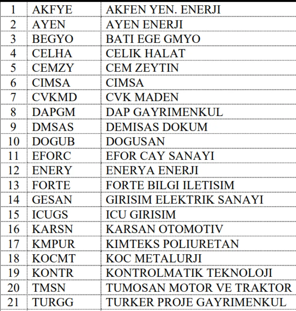 Geçerli olacak dönem ise 1 Mayıs 2025 ile 30 Eylül 2025 aralığı olarak belirlendi. Bu değişiklikte Bist Katılım Tüm Endeksi'ne alınacak paylar: