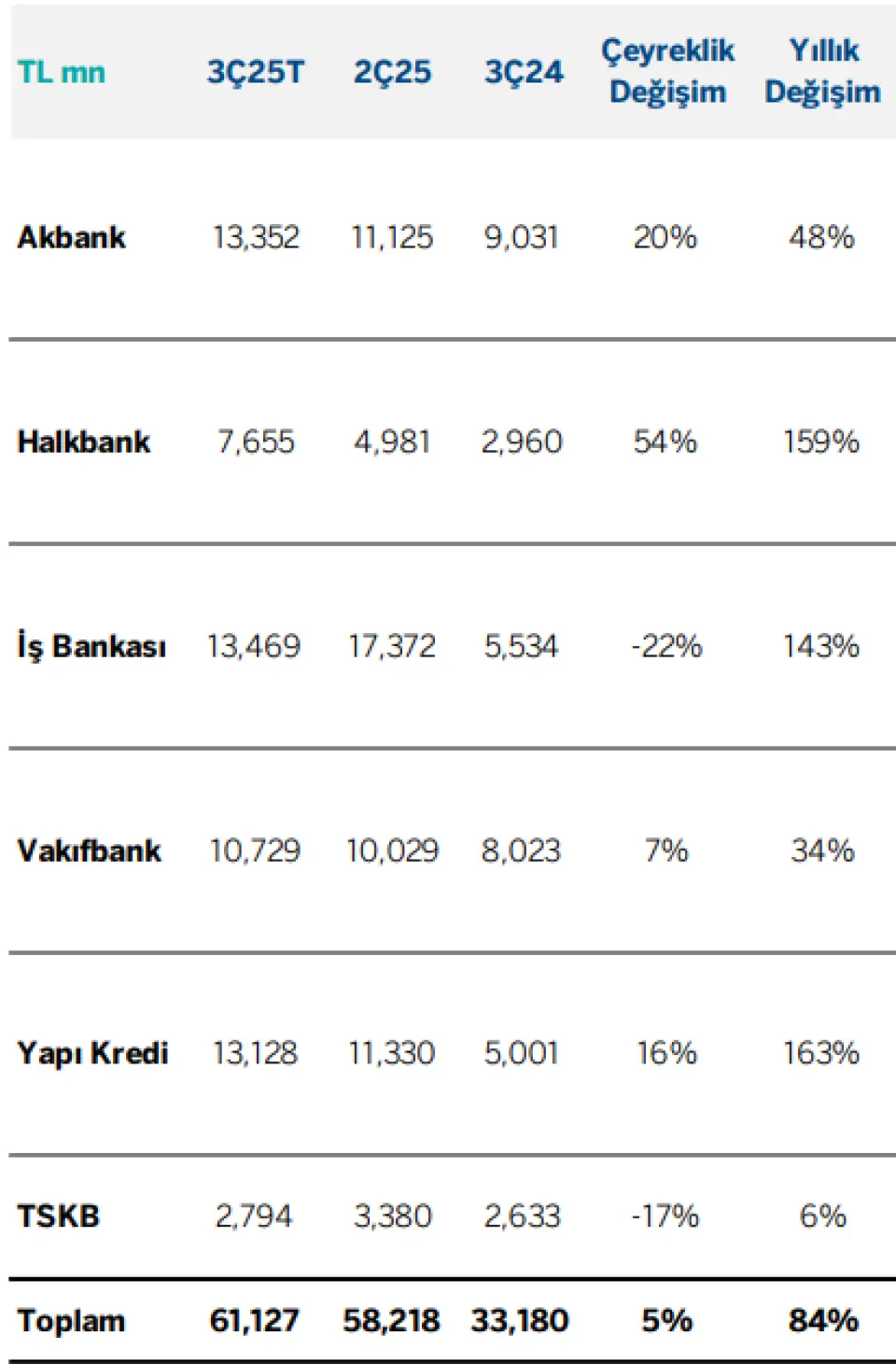 Bankalar üçüncü çeyrek sonuçlarını 23 Ekim’de Akbank ile açıklamaya başlıyor. Kapsamımızdaki bankalar için çeyreklik bazda %5 kar büyümesi öngörüyoruz.