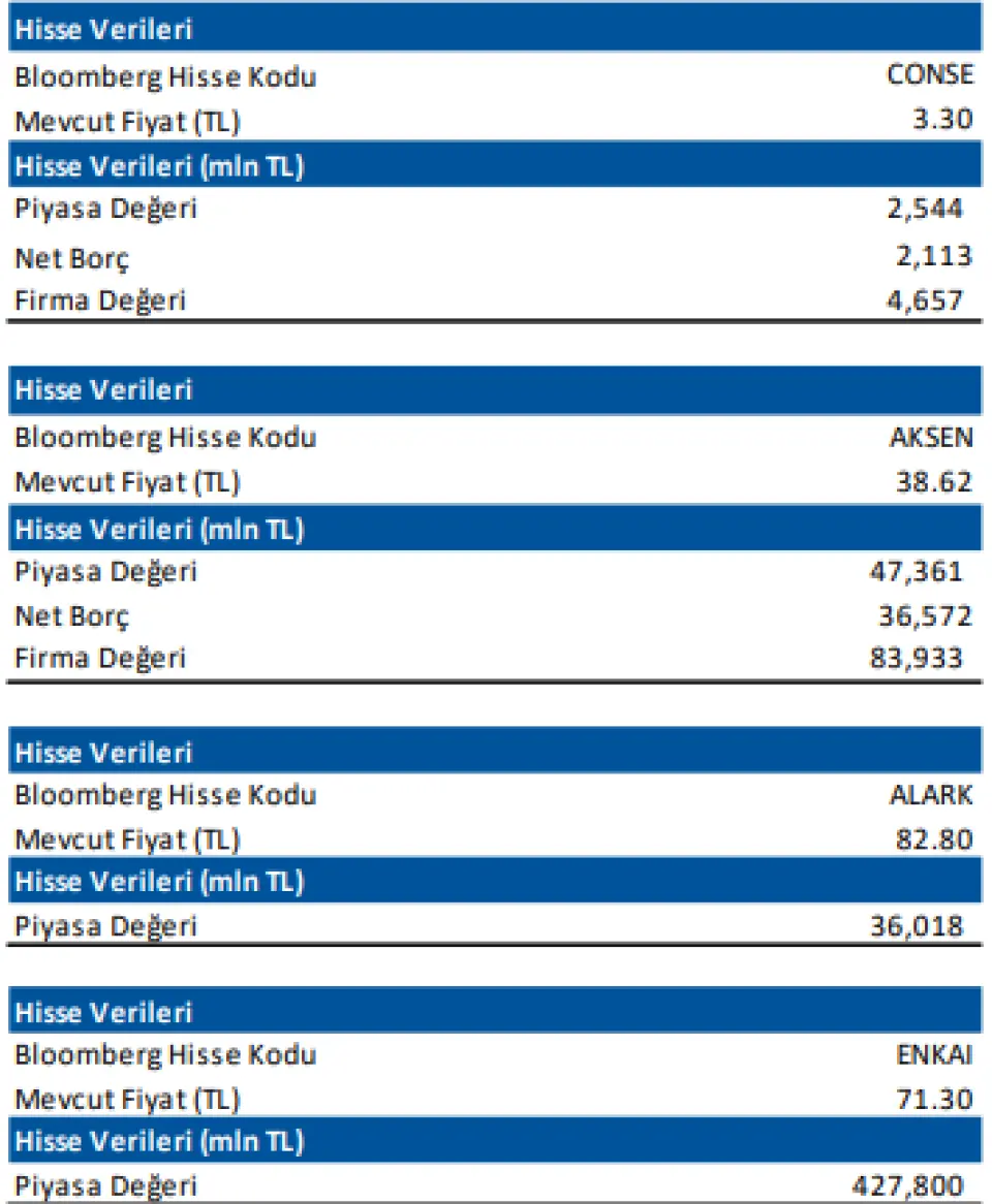 Daha önce yayımladığımız raporlardaki gibi, bu raporda da ALARK, AKSEN, CONSE ve ENKAI için ciro tahmini yapılmamıştır. Ciro hesaplamasında bulunmamamızın nedenleri; ALARK ve ENKAI tarafında enerji grubunun konsolide rakamlar içinde payının az olması, AKSEN tarafında satış gelirinin ağırlıklı olarak yurt dışı santrallerinden elde edilmesi ve CONSE tarafında ise dağıtık enerji iş kolunun toplam MW içindeki payının yüksek olması kaynaklıdır.