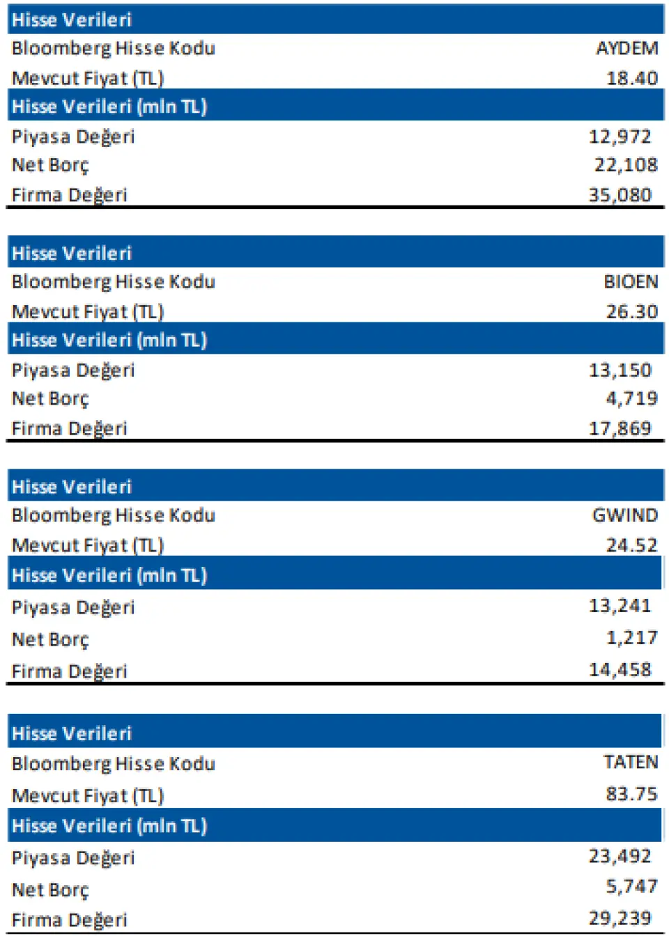 Aydem Yenilebilir Enerji, Tatlıpınar Enerji ve Consus Enerji şirketlerine, Deniz Yatırım Strateji ve Araştırma Bölümü olarak değerleme ve araştırma kapsamı çalışmalarımız mevcut değildir.