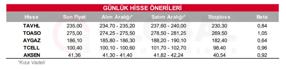 10 Ekim 2025 tarihinde Global Menkul Değerler tarafından paylaşılan günlük bültende, TAVHL, TOASO, AYGAZ, TCELL ve AKSEN olmak üzere toplam 5 hisse, günlük hisse önerileri listesinde yer almış oldu.