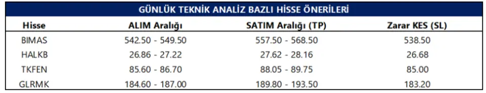Böylece Tacirler Yatırım tarafından 14 Ekim 2025 tarihinde paylaşılan günlük teknik analiz bazlı hisse önerileri listesinde, BIMAS, HALKB, TKFEN ve GLRMK hisseleri olmak üzere toplam 4 hisse yer almış oldu.
